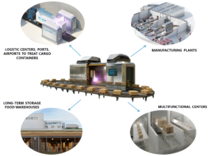 | Processing in packaging and containers | Products can be processed in hermetically sealed packages (bags, boxes, on pallets) and even whole shipping containers, which eliminates reinfection. |
