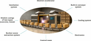 The E-BEAMBOX with electron accelerators are built to order and equipped with special ionizing radiation equipment considering a type of products to be processed. The two-side outlet of the accelerator allows processing products with E-beam and X-Ray both vertically (for products in boxes) and horizontally (for products on pallets).