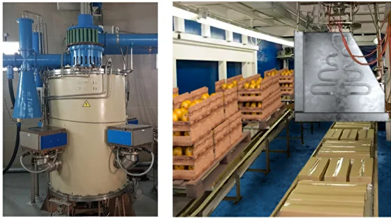 The electron accelerator’s outlet device has two windows. One window emits E-beam and X-Ray, which irradiate boxes and bags with products vertically; the second window emits X-Ray which irradiates products on pallets horizontally.
