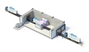 The E-BEAMBOX can be simultaneously equipped with 2 to 3 conveyor systems to irradiate products in boxes, in bulk in one layer, on pallets, in bags and in cargo containers.